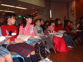 | 谷津南小学校6年生、武田莉枝ちゃん、湧井舞ちゃん、竹内采花ちゃん。谷津干潟の機能と重要性について3人で発表しました。手作りの図やぬいぐるみ、カービングを使い、中国・韓国の友だちに谷津干潟の生き物たちを紹介してくれました。 | 日本・中国・韓国の3カ国の子供たちが、アイディアを出し合って干潟新聞をつくりました。 |
