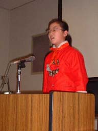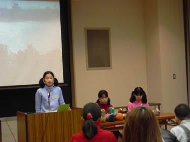 | 中国黒竜江省のワン・ユーティンちゃん(11歳)。故郷チチハル市にあるザーロン自然保護区(ラムサール湿地)とそこに集まるツルについて思いを語りました。 | 韓国慶尚南道昌寧郡のキム・ヒョンギョンちゃん(9歳)。 ウーポ沼について発表しました。沼に行くと、おばあさんに抱かれているような安らぎを感じるそうです。 |