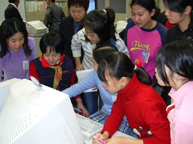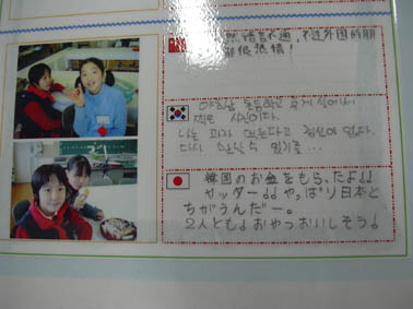 同じ日の午後には、「みんなでつくろう、干潟新聞!」ということで、3カ国の子供達が谷津南小学校に集まり、コンピューターを用いてみんなのアイディアを集結させた干潟新聞を作成しました。自分達で撮った写真を載せたり、絵を描いたり、みんなへのメッセージを書き込んだり、言葉も通じない3カ国の子供達が一生懸命にコミュニケーションをとりながら、それぞれにユニークな干潟新聞を作り上げていきました。「コミュニケーションがとれないのではないか」という私達の心配をよそに、3カ国の子供達は片言の英語や身振り手振りをつかって、あっという間に仲良くなり、私達学生ボランティアも子供たちの力に驚かされました。