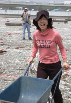 いよいよ整備作業か始まった。この日の作業内容は屋上にコンクリート片(丸い小石程度の大きさのもの)を敷きならすというものだった。一輪車を使ってコンクリート片を運び、スコップやトンボで営巣地全体に敷きならす。か弱い女(!?)の私にとっては、重労働だ。腕や腰は痛いし、熱い日差しは容赦なく照りつける。まったく、大変な作業だけれど、音を上げたりはしない。すべてはコアジサシの営巣地を作るための作業だ。4月になったらあの美しい鳥がここへやってくる。鳥たちはここで卵を産み、ヒナを育て、やがて成長したヒナとともに南半球へ飛び立っていく。そんなドラマを頭にイメージしながら整備作業を続けた。