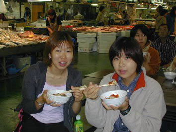| 「どう、あたしの丼は?」「だてに、イクラとタラコをのっけて ないわよ!」釧路、和商市場での一コマ。 |