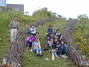 霧多布湿原センター前に、やちぼうず木道という観察路があるんですが、そこへの道がわかりにくい!!というご意見が多く寄せられたので、垣根の道を作りました。その際、伐採された木を用いて道を作りました。垣根の間にちょっとした生き物が住めるし、木の有効利用という面から見てもイケてるし、、かなりの自信作です。