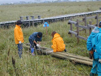 霧多布湿原トラストの周辺にある仲の浜木道は、霧多布で最も古い木道です。この木道が最近腐ってきてしまい、安全面で不安があるので、トラストの方々と一緒に、木道の補修・新設を行いました。新設によって、琵琶瀬木道と仲の浜木道がつながって、今まで以上に快適に湿原をのぞくことができるようになりました。