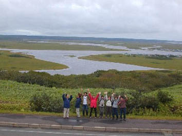 なかよし小径で記念撮影。左の方は、キャンプ中にお世話になっ た湿原センターの長岡さんです。 |