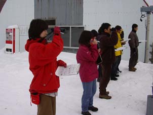丸1日かけて釧路湿原をぐるっと一周しながら、タンチョウや釧路湿原で起きている問題を自分達の目で見てきました。色んな立場の方(タンチョウ給餌人、タンチョウの食害を受ける農家の人、など)にも直接お話を伺うことが出来ました。温根内ビジターセンターの若山さんの案内で雪の湿原をクロスカントリースキーで散歩したり、環境再生事業が行われている現場を見たり、トラストサルン釧路による植林地を見学したりもしました。最後は釧路湿原に沈む夕日に、一同静かに見入っていました。<参加者の様子>