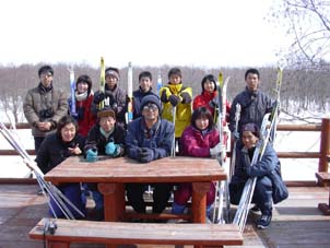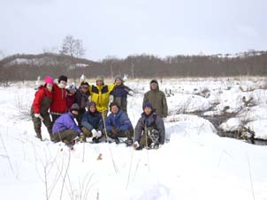 | 野外セミナーの途中で記念撮影! 歩くスキーで、釧路湿原の中を散策した! 真ん中にいるのは、元レンジャーの日高さん。 |