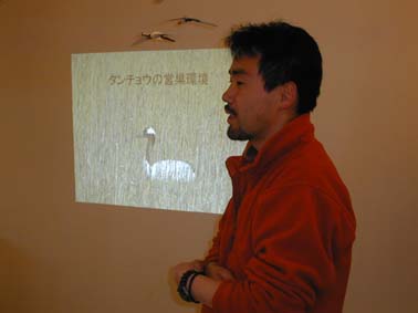 | タンチョウの説明を真剣に聞く参加者・・・ | タンチョウの話をする、音成レンジャー |