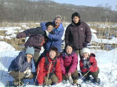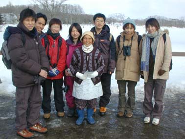 | 野外セミナーの一場面 何十年も給餌を続けてきた、渡部トメさんと記念撮影! |