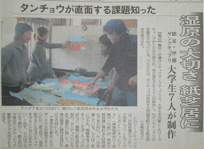 さて、我々の今回のワークキャンプでの任務は、いかに食費を浮かせて1週間やりくりするか、ではなく、それもあるけど、釧路湿原の自然にふれる中で、タンチョウ紙芝居を作ることだった。サンクチュアリではタンチョウの保護活動をしており、この季節はもっぱら給餌活動をしていた。