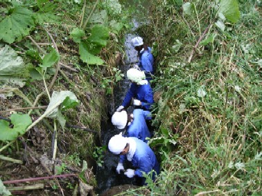 自然再生事業のひとつです。まっすぐな現行河川と蛇行した旧河川をつなぐ部分にたまった土砂を取り除き、旧河川に流れを作ります。これは、旧河川の復元によって、生物の繁殖がみられるかデータを取るために行うものです。膝上まで水につかり、(長靴の中は泥と水です。)泥という形のない物をスコップで集めて取り除くという、根気と体力を必要とする作業でした。作業中はアブとも戦わなくてはならず、作業が終わる頃にはみんな立派なアブハンターになっていました!とても大変な作業でしたが、作業前にはなかった旧河川への水の流れを、終了時には取りもどすことができました。