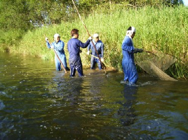 | 野外セミナーで崖のぼり?! | 遡上調査中。魚を網に追い込め!! |