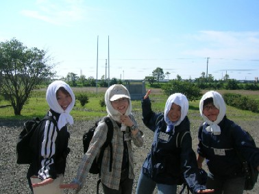 2.蚊やアブなどから身を守るためにはこれが一番。 日よけにもなる!「やっぱほっかむりだよね〜♪」 |