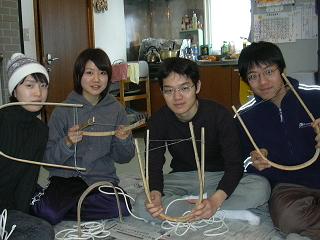 ました。昨年の作業で曲げておいた竹を、2つ組み合わせて縄で編みました。作り方