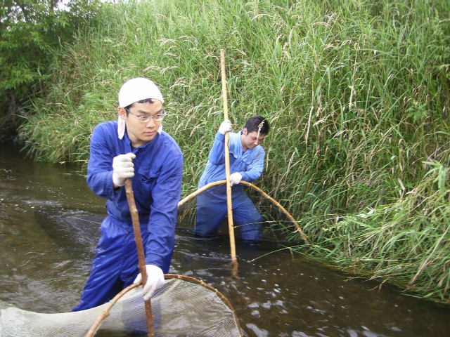 キナシベツ湿原沿いを流れる直別川の健康状態を調べるための調査です。サケやカ