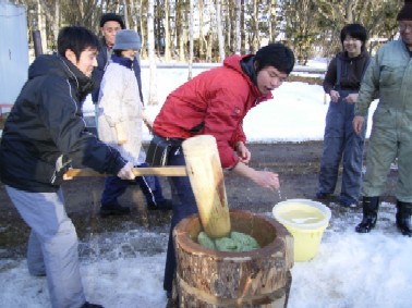 | 広くて青い空の中!果たしてワシは姿を現すのか!? | 雪上餅つき♪地域の方々がお手伝いしてくれました。 |