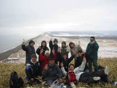 | 雪の上…?いえいえ、川の上なんです!凍り付いているのでへっちゃらです! | 野外セミナーお馴染みの“ヘシヘハケ岬”みんなテンションあげあげです♪ |