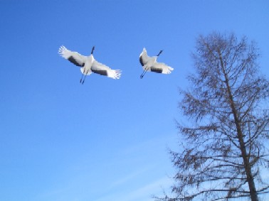 | 1.ねぐら調査中。遠くに飛んでいるタンチョウを必死に探します。 | 2.こんな間近で、タンチョウが飛んでるのを見ることが出来ました♪ 感動です!! |