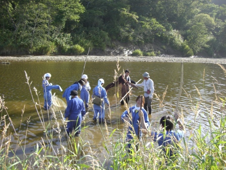 4.溯上調査 溯上調査は直別川の状態を測る指標として、毎年行っている調査です。 川下から登っていき、一定の間隔で追い込みを行って魚を捕らえ、 捕らえた魚を同定し記録していきます。 今年はまだウグイが多く、昨年記録があったアメマスなどは見られませんでした。 直別川は時期によって河口が開いたり閉じたりします。 今回の結果は河口が開いていなかったためアメマスなどの溯上性の魚が見られなかったと思われます。 ![]()