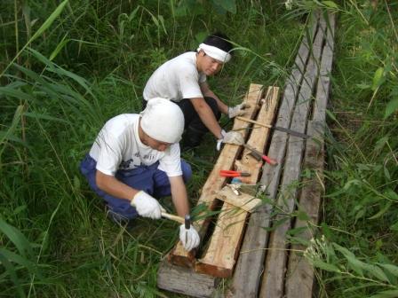 3.看板立て 多くの人に湿原の良さや大切さを知ってもらうためつくられた、 春のワークキャンプで作製した看板を立てました。 場所を選び、穴を掘って柱を立てた後に看板を取り付けていきました。 整備した木道にも看板を設置しました。 ![]()