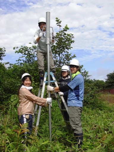以前に裸地化した場所にハンノキやミズナラなどの苗木を植樹した場所が、シカの食害にあっているためシカ柵を設置する。今回は3種類(魚網、プラスチック、鉄柵)のシカ柵を作り実験し、今後一番効率的なものを選ぶためにシカ柵を設置しました。 |