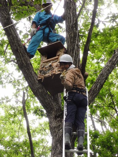 フクロウのために設置してある、巣箱の中に木屑を入れました。約5〜8メートルの木の上での作業だったので、態勢が不安定で作業が難しかったですが、事前に体育館でロープワークを練習したので安全に作業する事が出来ました。そのほかに2ヶ所の巣箱をフクロウが使用しているか調べました。今回は使用形跡は見られませんでした。 |