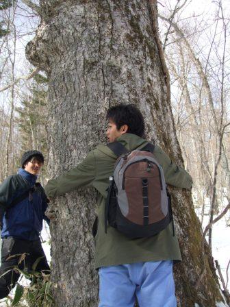 そして原生林にも足を踏み入れた。北海道の原生林は針葉樹と落葉広葉樹で形成されている。正直、原生林=照葉樹林というイメージのある本州の私は、光が常に差しこむ落葉樹の森にはそれほど期待していなかった。しかし、はじめて見たカツラの樹は、大きかった。春を待つキナシの森でひっそりと、でも雄大にたたずんでいた。その生命感に圧倒され、本当にキナシベツに来て良かったと思った。
