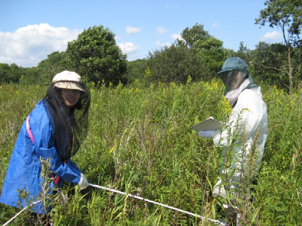 50m間隔で設置された38本のライン(70m)に沿って、オオアワダチソウ、セイタカアワダチソウ、ユウゼンギクがどの程度生えているのかを1mごとに区切って調べ、記録していきました。