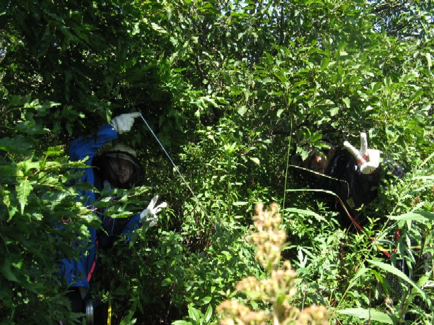 | 「こんな藪の中も調査します!」 |