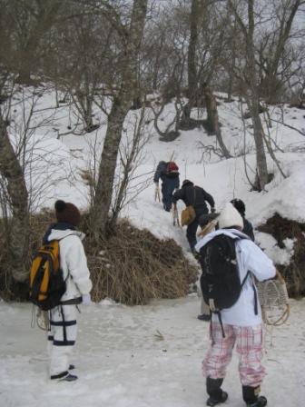 @地形図(正確ではない)を頼りに、かんじきを履き雪の中を歩きます。