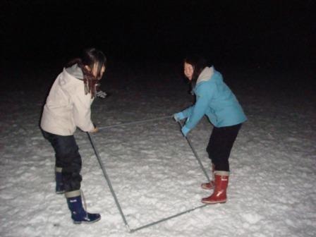 @朝、給餌を行なった直後と、夕方のタンチョウがねぐらへ帰った後の2回、給餌場に1m×1mの方形区を設置し、その写真を撮る。これを直線状に30mの地点まで、合計3本の写真を撮る。