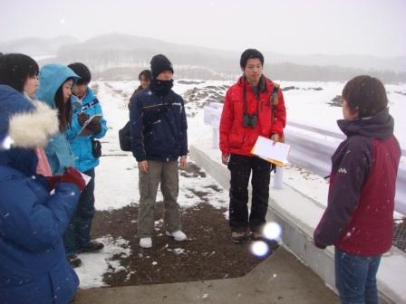 受け入れ先の方に鶴居近辺を案内していただきながら、サンクチュアリ以外の給餌場や牧草地、排水路などでタンチョウの現状と問題、住民との軋轢の解説や野生生物保護センターや郷土資料館などでタンチョウをとりまく自然環境について解説をしていただきました。 |