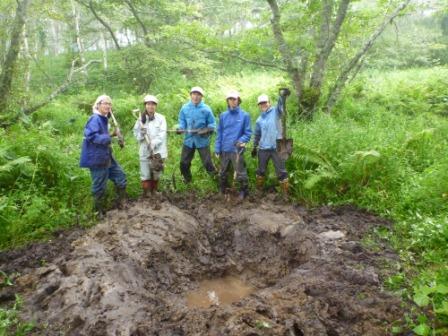 早春にシマフクロウの餌となるエゾアカガエルが集まって繁殖できる池を堀り、シマフクロウの餌場を作りました。 |