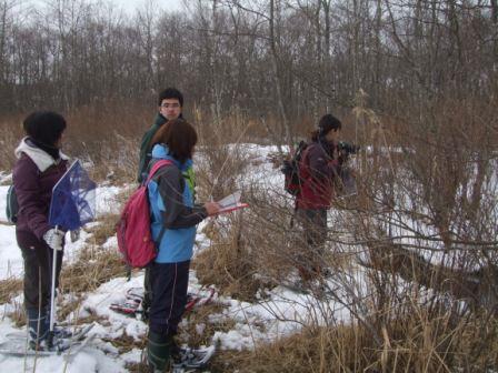 今までの調査により、牧草地やタンチョウ自採食地の管理候補地である手塚農場の水路へ行き、凍結の有無、水面の広さ、樹木の密度、タンチョウの利用の痕跡(足跡)などを記録して今後の管理のための調査をしました。 |