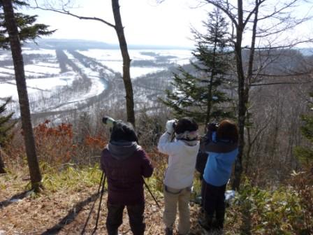 2大給餌場(鶴居・伊藤タンチョウサンクチュアリ・鶴見台)周辺やねぐら、牧草地が見わたせる山などの高い調査ポイントへ行き、給餌場以外にタンチョウが利用している場所を探し、その利用状況を望遠鏡や双眼鏡などで調べ、タンチョウの位置と行動を記録して、タンチョウが普段どのような場所でどのような行動をしているか調べました。 |