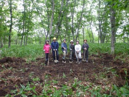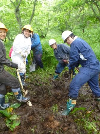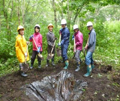 渡邊野鳥保護区フレシマにはシマフクロウが早春に餌とするエゾアカガエルを見つけやすい環境を作るために森林内にカエルの産卵池が造成されています。今回は産卵期が終わり破損も見られるため、泥を取り除く、シートを整える補修作業を行いました。 |