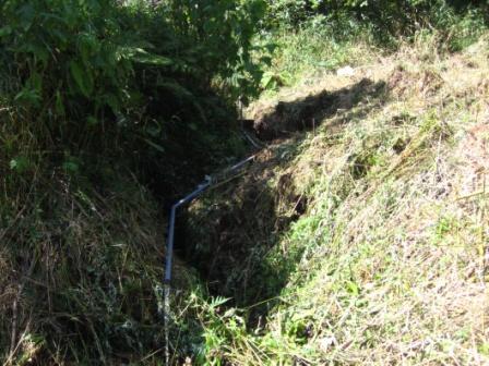 | 塩ビパイプを通して上流から水を引き、冬場に池が凍らないように一工夫します。 |