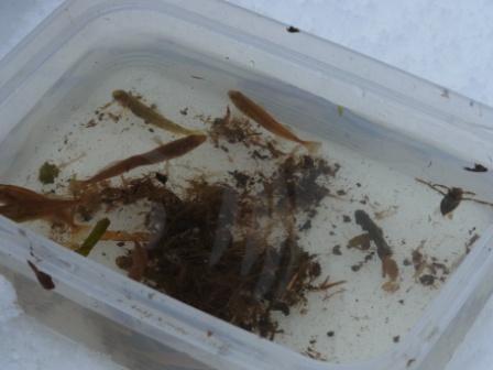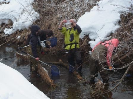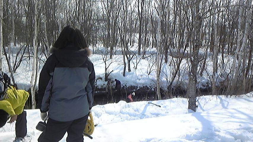今までの調査により、牧草地やタンチョウ自採食地の管理候補地である手塚農場の水路へ行き、凍結の有無、水面の広さ、樹木の密度、タンチョウの利用の痕跡(足跡)などを記録して今後の管理のための調査をしました。 |