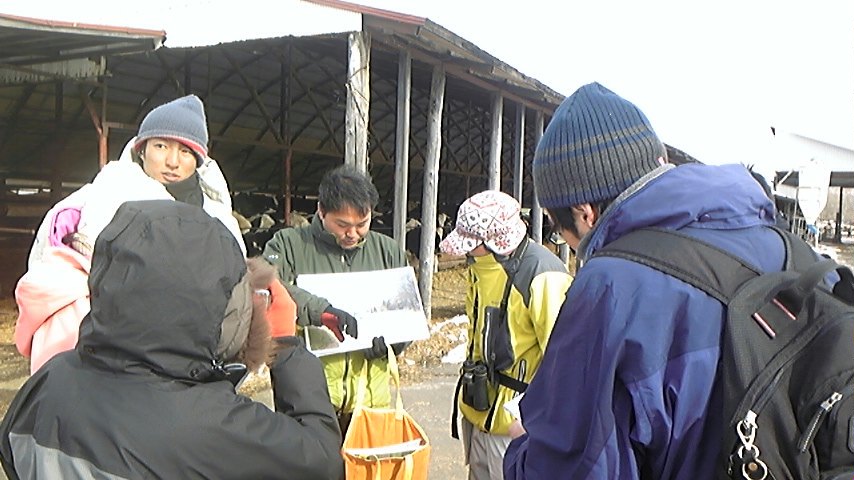 タンチョウがねぐらと給餌場以外のどこで、どのくらい過ごしているかを把握するための調査。鶴見台、中雪裡1号付近の山、下雪裡付近の山の3つのグループに分かれ、鶴見台グループは時間内での鶴見台にいるタンチョウの数とリングの記録、山側のグループは畑や河川を見降ろして観察しながら時間内に訪れるタンチョウの行動や数を記録した。鶴見台グループは1人ずつ交代で、有田レンジャーと共に鶴居村を一周して農家や視界に入るタンチョウを記録し、タンチョウが普段どのような場所でどのような行動をしているか調べました。 |
