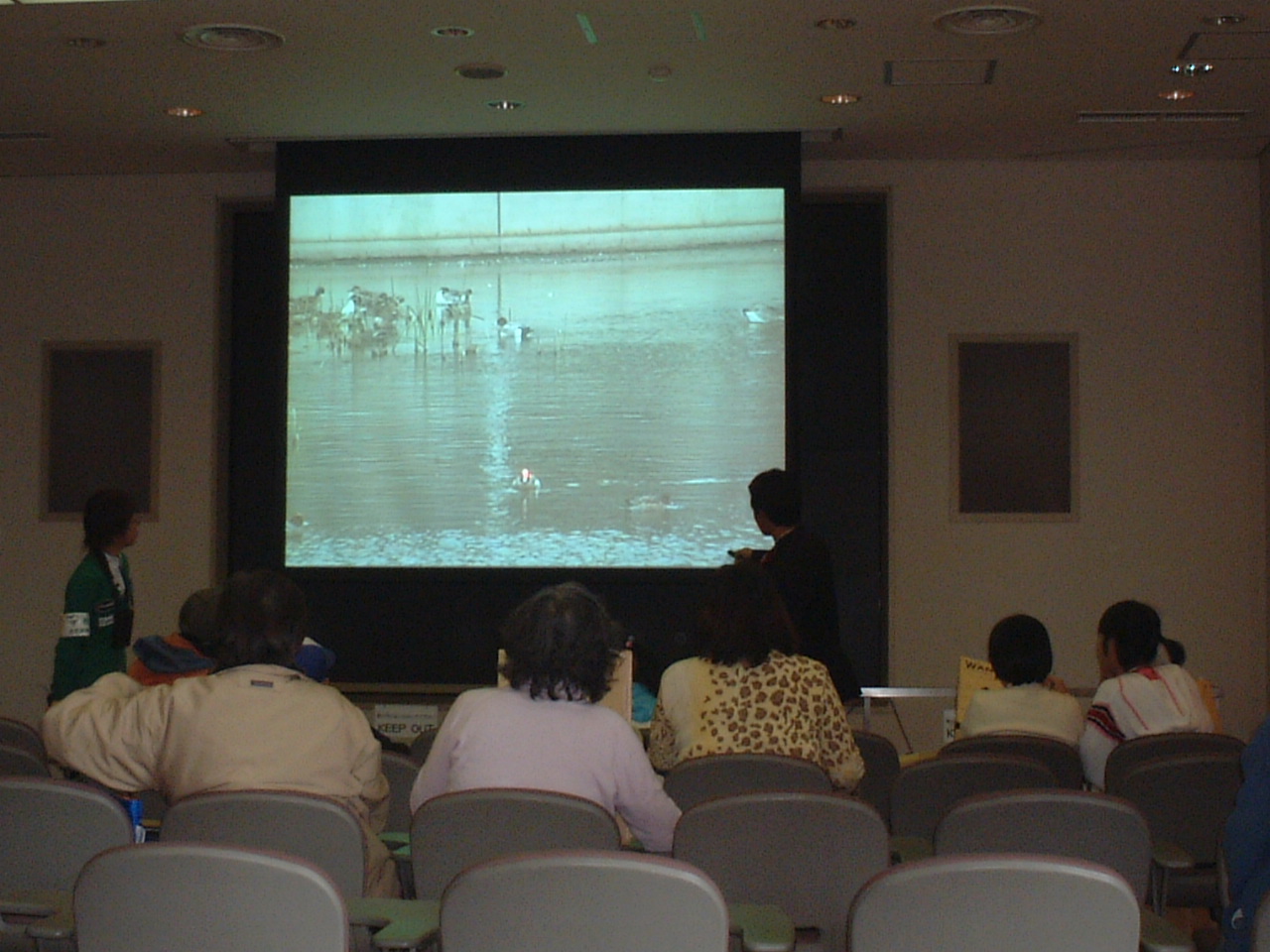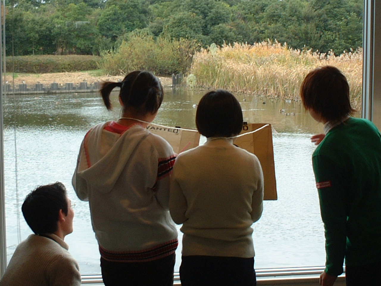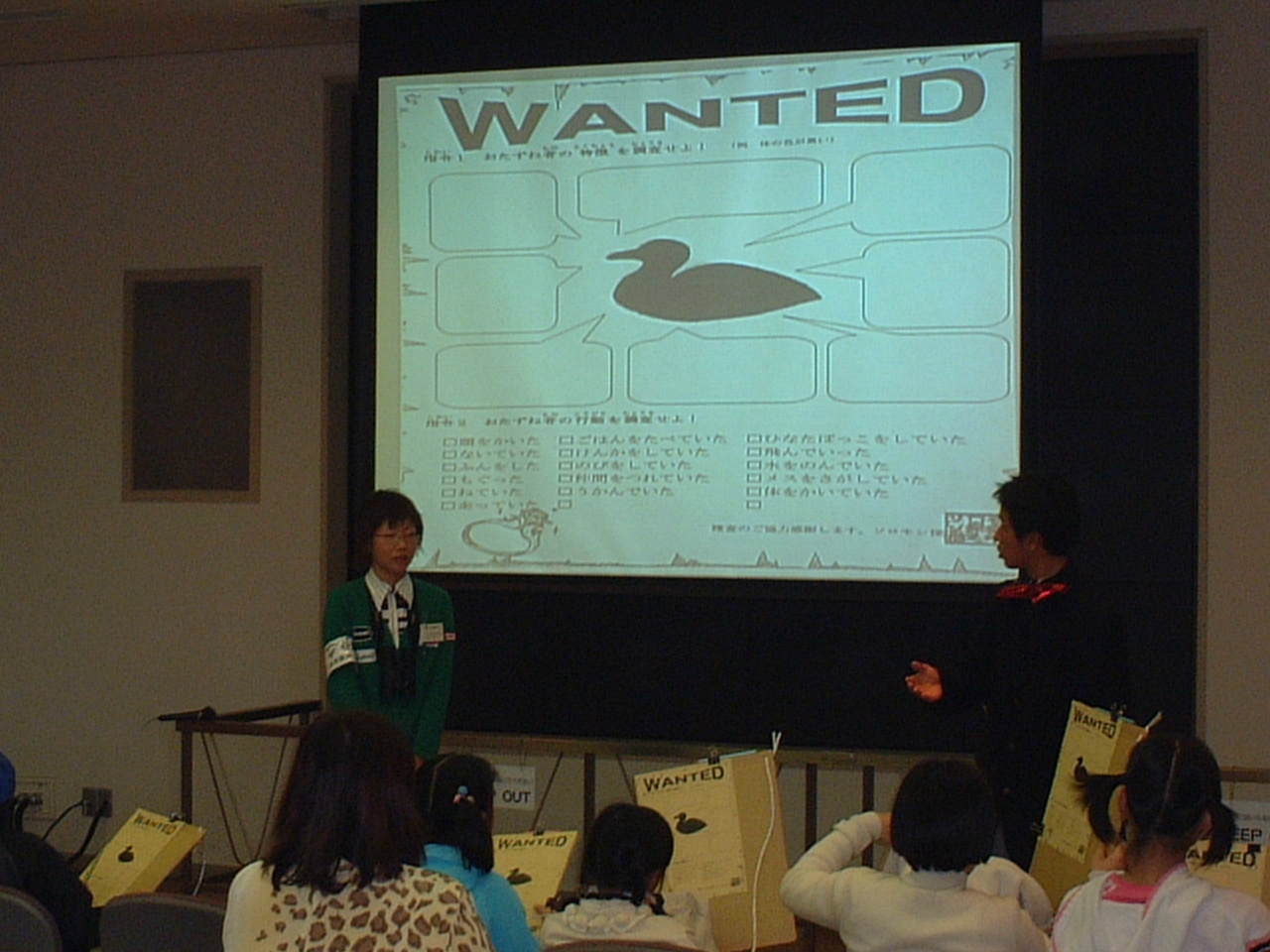 子供たちは現場に急行。 手がかりを元に犯人がどの鳥かを観察して特定して行きます。 「あっ、お姉ちゃんあの鳥だよ!!」 |